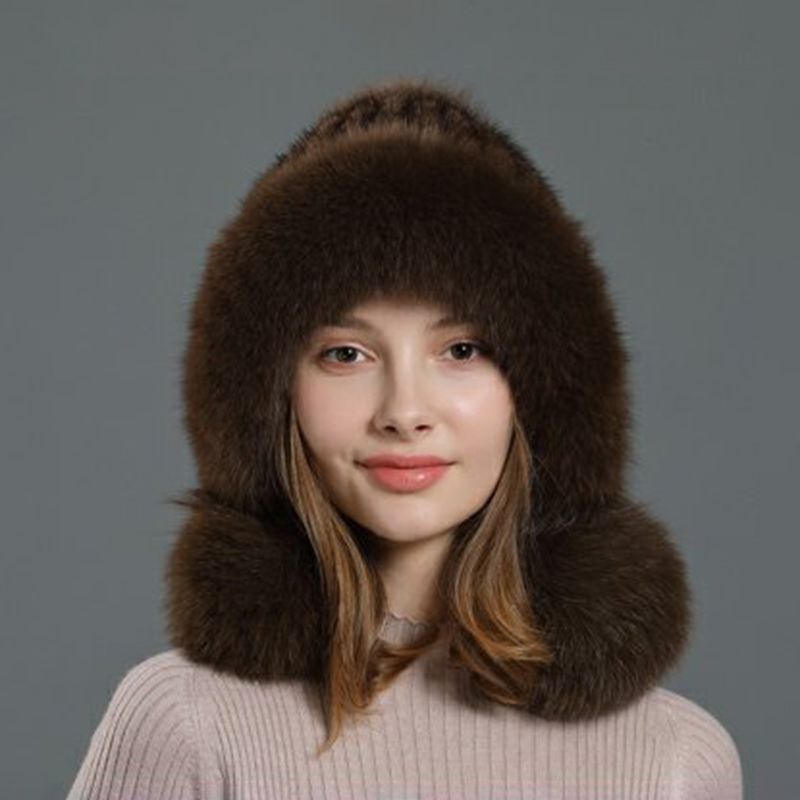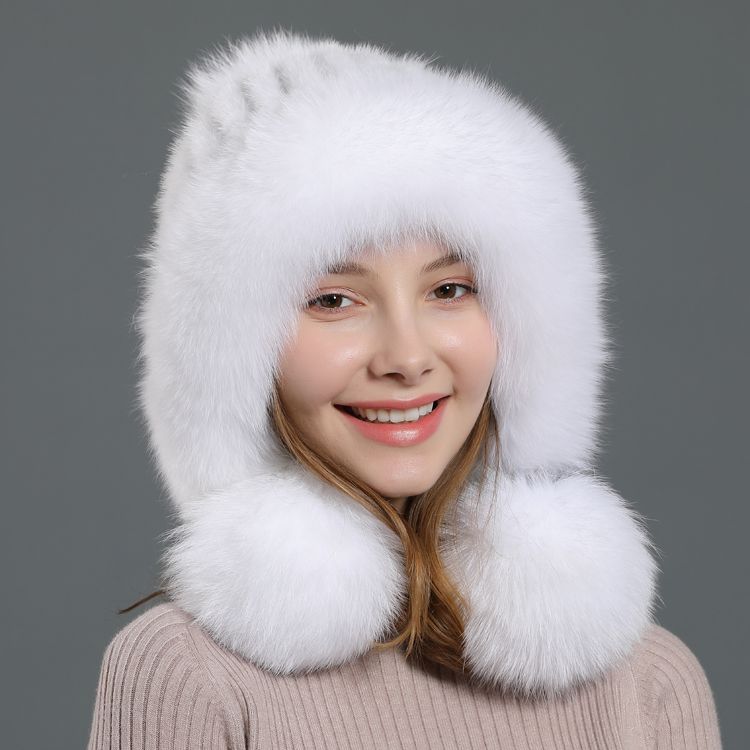 Luxury Real Mink Fur Hat with Fox Fur Trim Women Winter Knit Beanie with Pom-Pom Ear Flaps